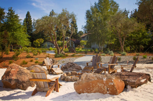 Some big rocks surround the chairs, and the fire pit is also made out of stone to match the rocky landscape.